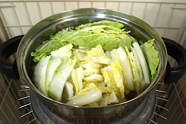 白菜と人参を適当な大きさに切り、挽肉といっしょに鍋に投入(肉 → 人参 → 白菜の順に投入するのが好ましい)。コンソメまたはブイヨンを入れ蓋をしてひたすら弱火で煮る。途中、面倒でなければアク取りをするが、この工程を省くとさらに男らしさがアップする。