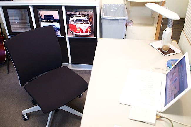これ、椅子の上に正座する人にとっては非常にポイントの高い機能です。正座したときのつま先が、ちょうどこの隙間に入り込むことになるんです。ココに隙間ができない椅子は、つま先のスペースがなくて窮屈なんですよね。…って、椅子の上に正座する人を想定して椅子の設計をするわけではないのでしょうし、そんなニーズはマイノリティーであることは解っていますよ(笑)でもね、気合い入れて仕事する時は、正座の方が落ち着くんです。背筋が伸びるので腰も痛くなりにくいですし!!
