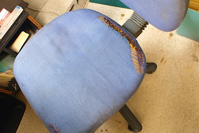 そろそろ限界です。座面の後ろの、通常、おしりが当らないような部分が局部的にすり切れているのは、ボクが椅子の上に正座をするからです。そこに、ちょうどボクの足の甲が当たるんです(笑)