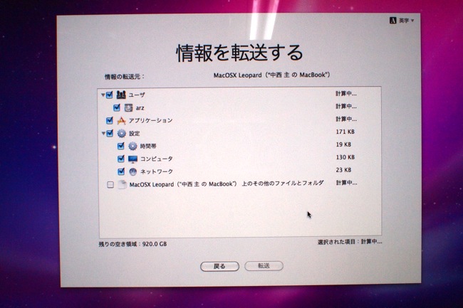 本日届いたiMac上から、つい先ほどまでMacBookのバックアップに使っていた外部HDD(AirMac経由で接続しているのでワイヤレス)を選択すると、上のような画面が現れ、どのデータをバックアップから転送するか選べるようになっていました。ユーザ情報の中には、書類やiTunes用の音楽ファイル・写真・メール・WEBからダウンロードした全ファイル・GarageBandで作成した音楽ファイル・iMovieで作成した動画ファイルなど、いっさいのデータが含まれているようです。また、コンピュータの設定やネットワークの設定も転送するようにしたので、メールアカウント情報やWEBキャッシュ・会員サイト等のIDやパスワードまで引き継いでくれないかなーと、ちょっと期待しているんですが…